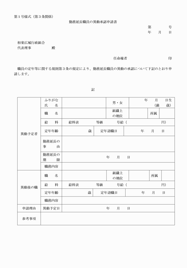 第3条 任命権者は、勤務延長をされている職員(以下「勤務延長職員」という。)を異動させる場合には、あらかじめ、勤務延長職員の異動承認申請書(別記第1号様式)を提出して、代表理事の承認を得なげればならない。この場合において、当該申請書には当該職員の履歴書を添付しなければならない。
